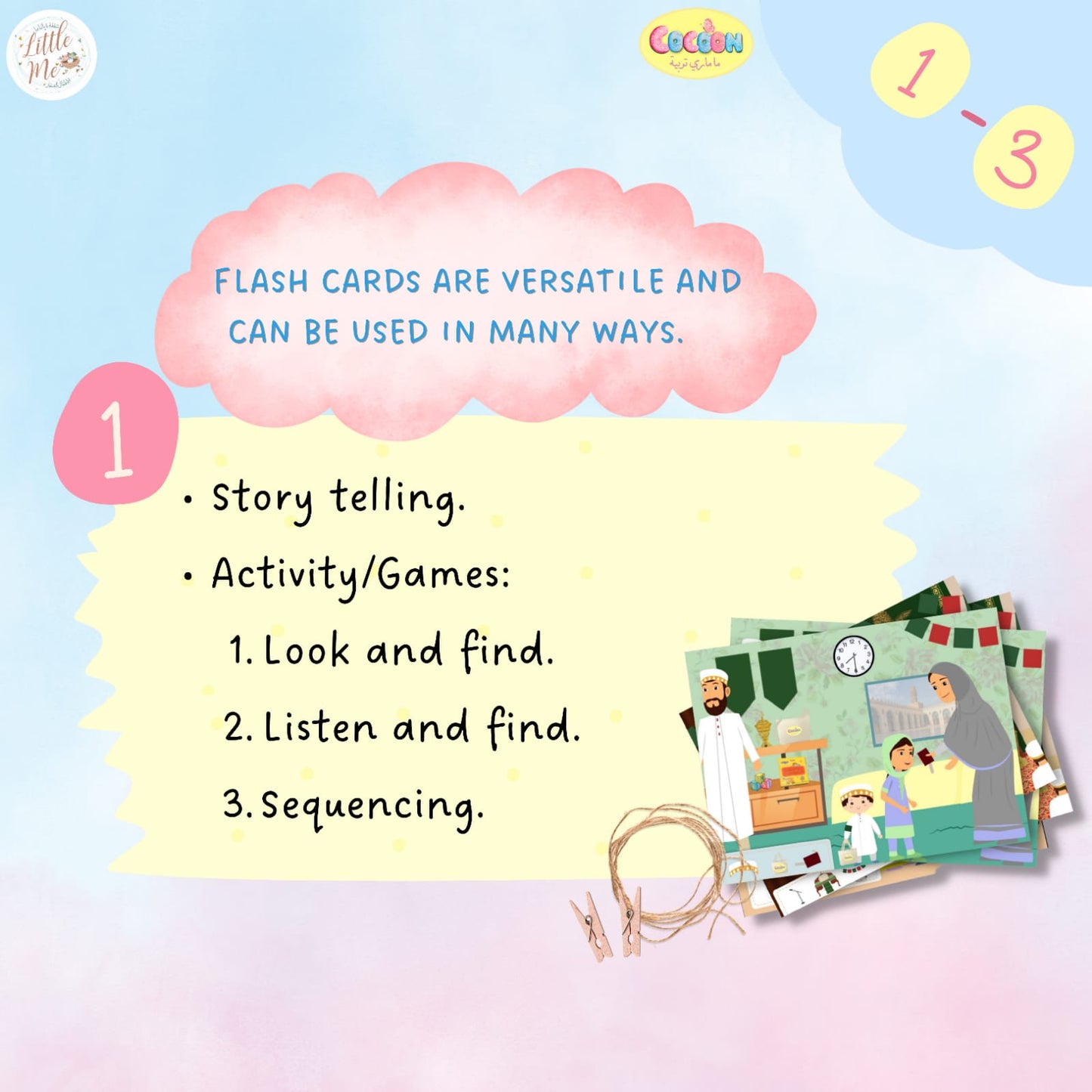 Ashara wastey maari tayyari! These set of flashcards can be used for storytelling and preparing your child from ages 1 -3 for the barakat wala dino. Includes: 7 Flash cards: can be used for storytelling and activity 2 D clock with moveable hands 2 D bag packing activity More details and description in the images.